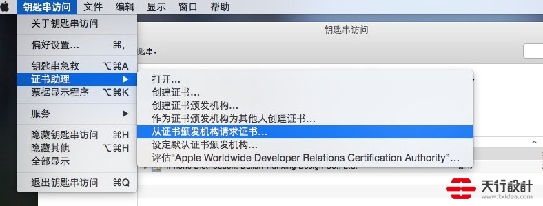 好的,我們現在打開mac or AIR 請隨意~的Launchpad,找到“鑰匙串訪問”,打開之后,不用等界面出來,直接在上方導航條中選擇“鑰匙串訪問”目錄下的“證書助理”,選擇“從證書頒發機構請求證書”。如下圖十: