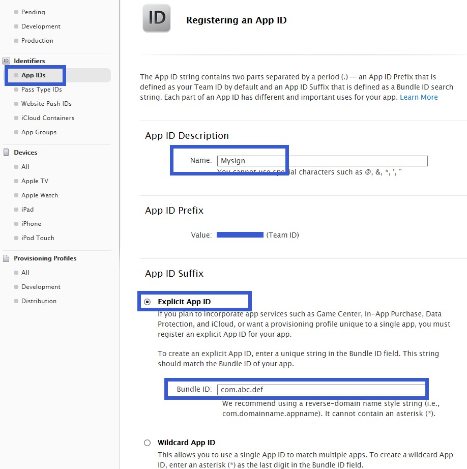 點擊左邊目錄中的“Identifiers”下的“App IDs”,這里是為我們的工程創建一個標示,也就是俗稱簽名,只有滿足標示的工程才能進行真機調試與發布。