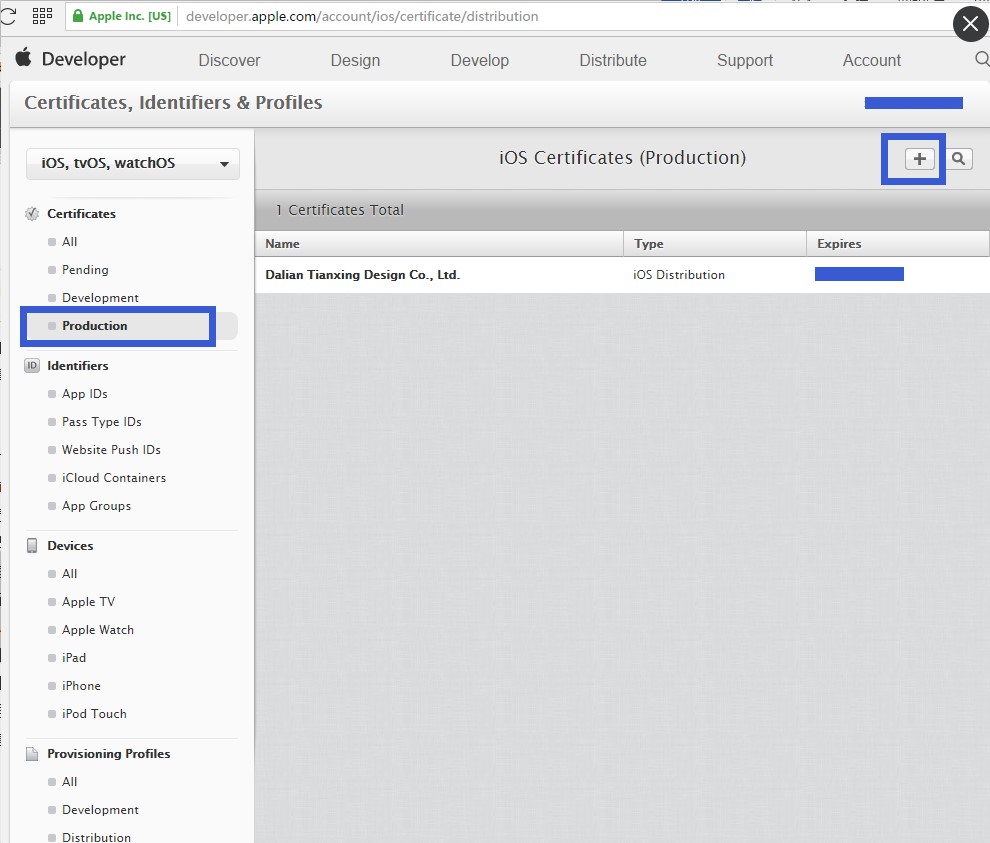 進入:Production(發布) 點擊右上角 + 進行證書添加