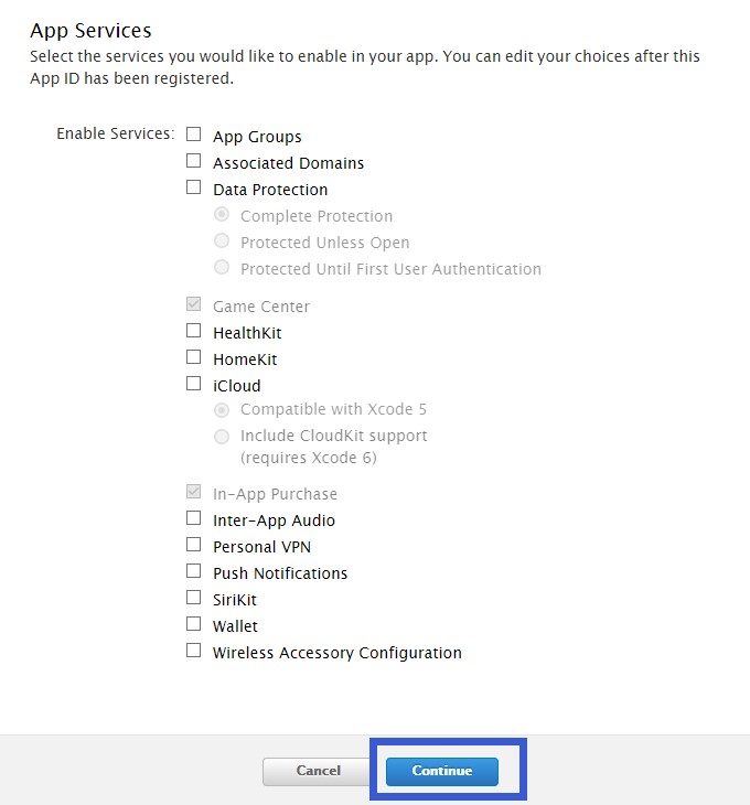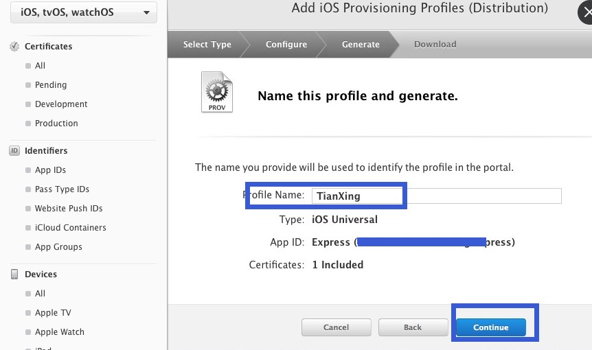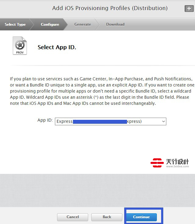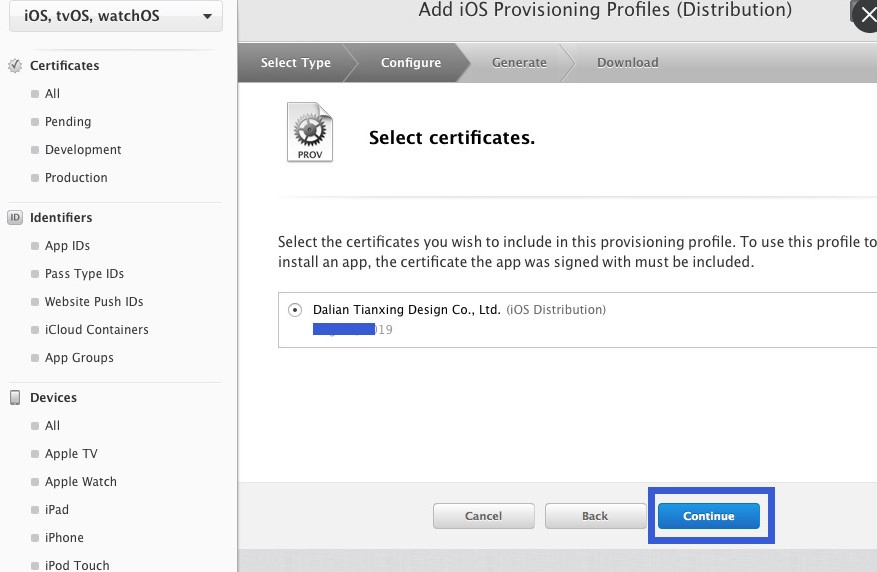 這一步,我們繼續點擊“Continue”。這一步是說,需要電腦的鑰匙串配置文件,稍后我會給大家說,所以我們先點擊“continue”,進入下一步。