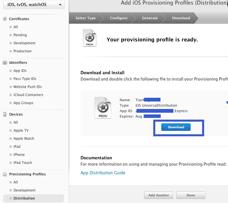 Provisioning Profiles,這個東西是很有蘋果特色的一個東西,一般稱之為PP文件,該文件將appID,開發者證書,硬件Device綁定到一塊兒,在開發者中心配置好后可以添加到Xcode上,也可以直接在Xcode上連接開發者中心生成